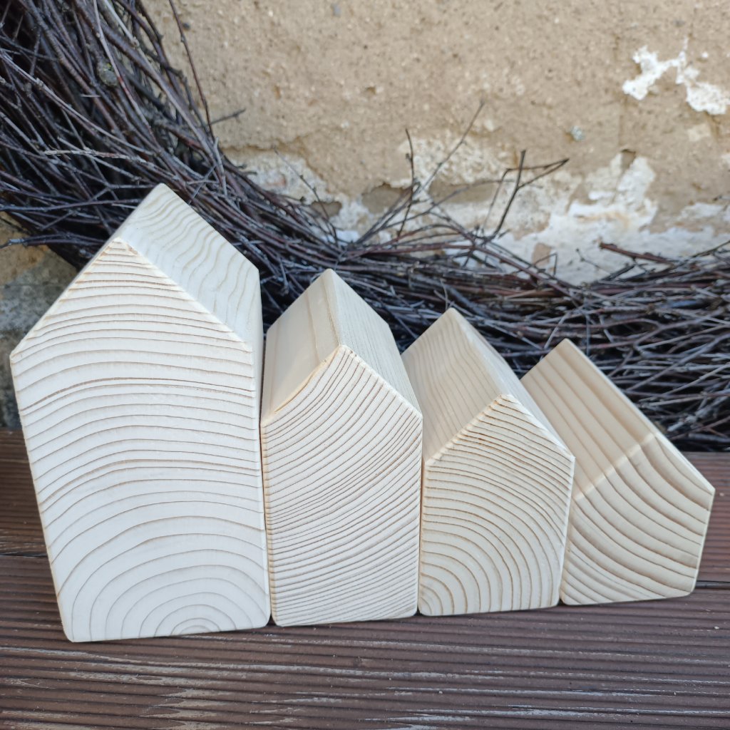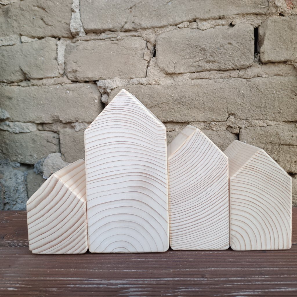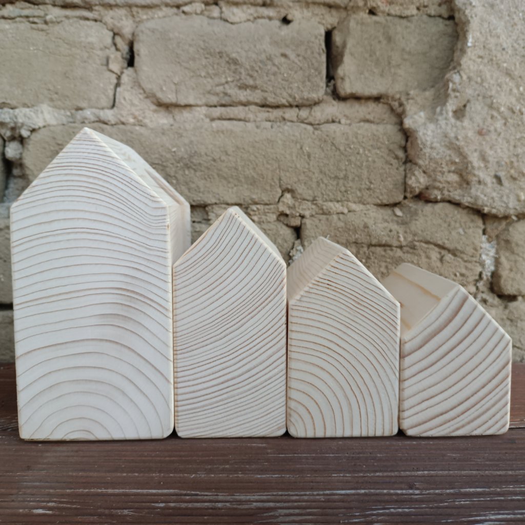 Tato sada obsahuje 4ks středně velkých dřevěných domečků, které vytvoří pěknou sestupnou řadu podle velikosti. Domečky se liší výškou, ale mají stejnou hloubku. Jednotlivé domečky jsou obroušené a mají zaoblené hrany.