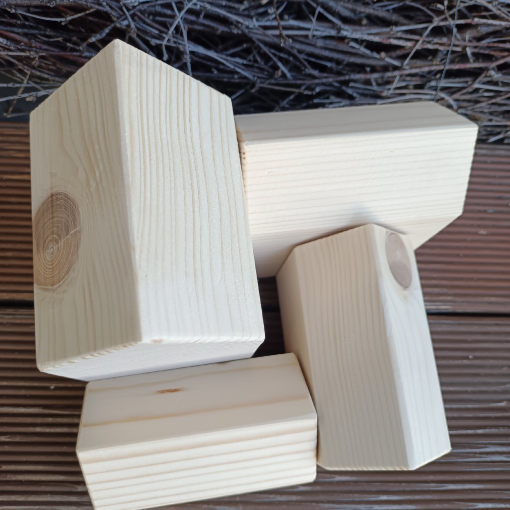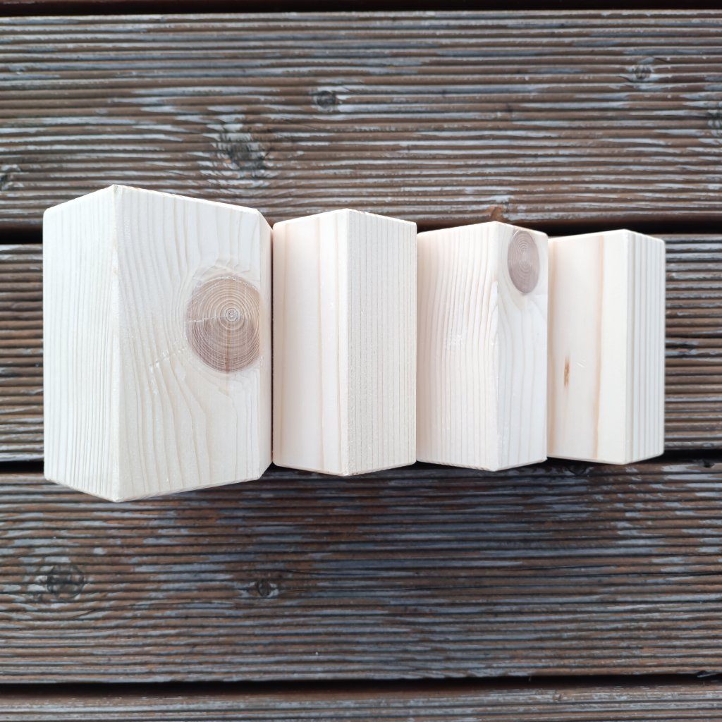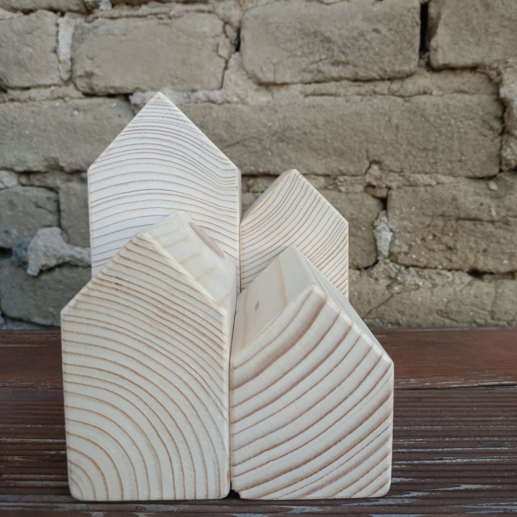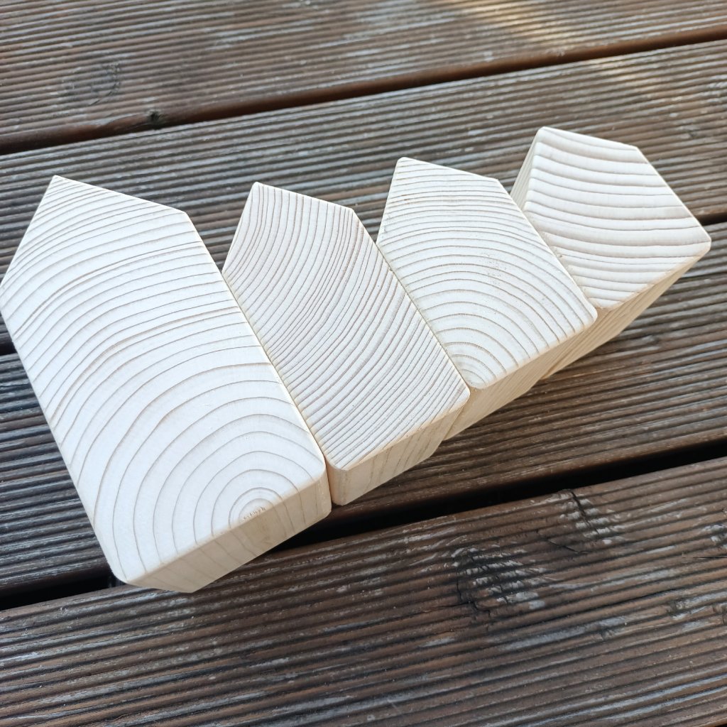 Tato sada obsahuje 4ks středně velkých dřevěných domečků, které vytvoří pěknou sestupnou řadu podle velikosti. Domečky se liší výškou, ale mají stejnou hloubku. Jednotlivé domečky jsou obroušené a mají zaoblené hrany.