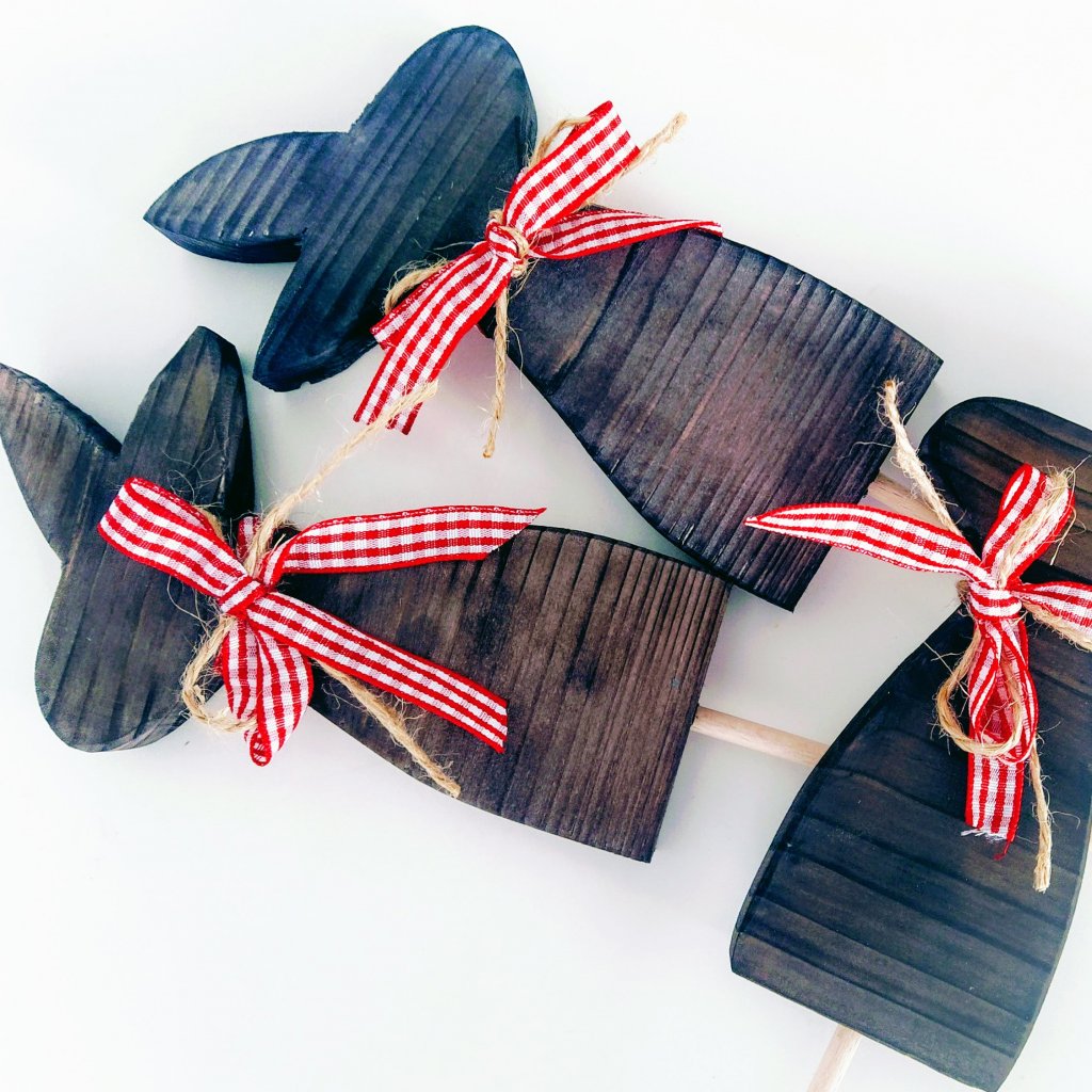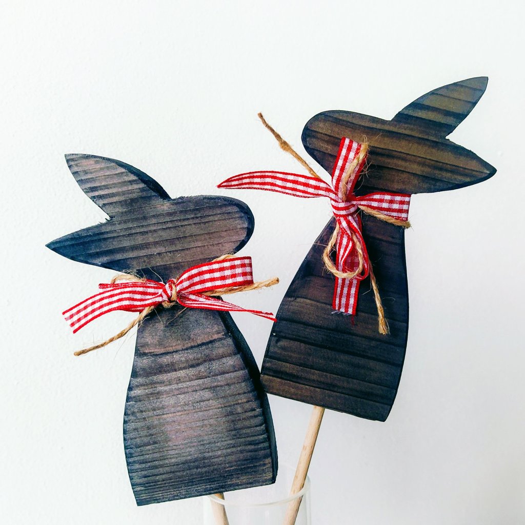 Zajíček Bob mini je ošetřený tmavým hnědým mořidlem a doplněný červenou - bílou stužkou ve venkovském stylu a provázku. Zajíček je na zápichu z bukového dřeva.
