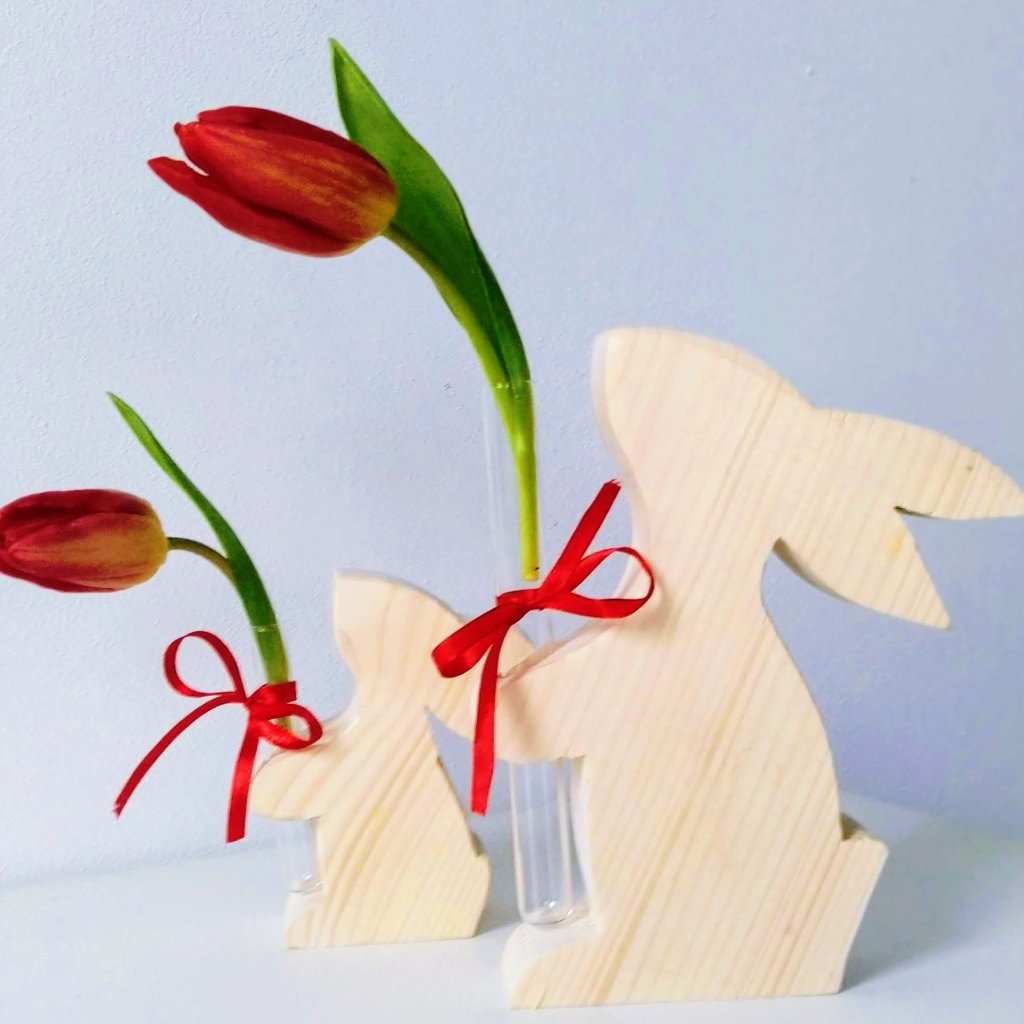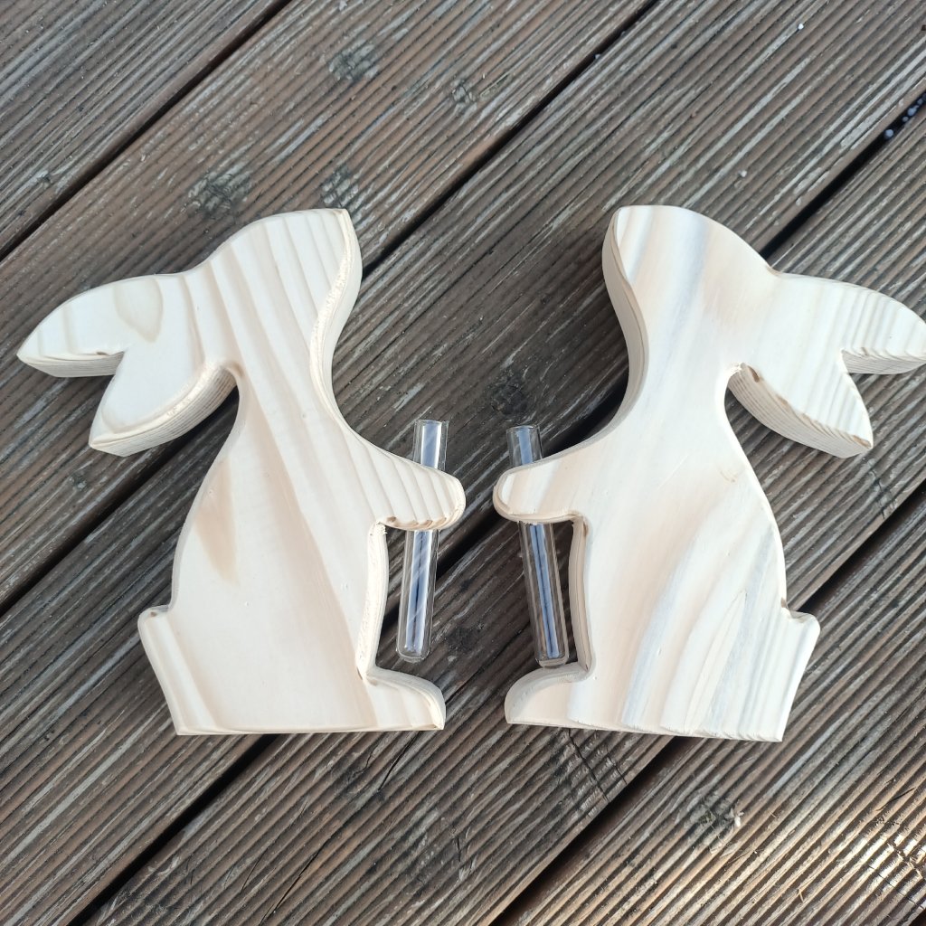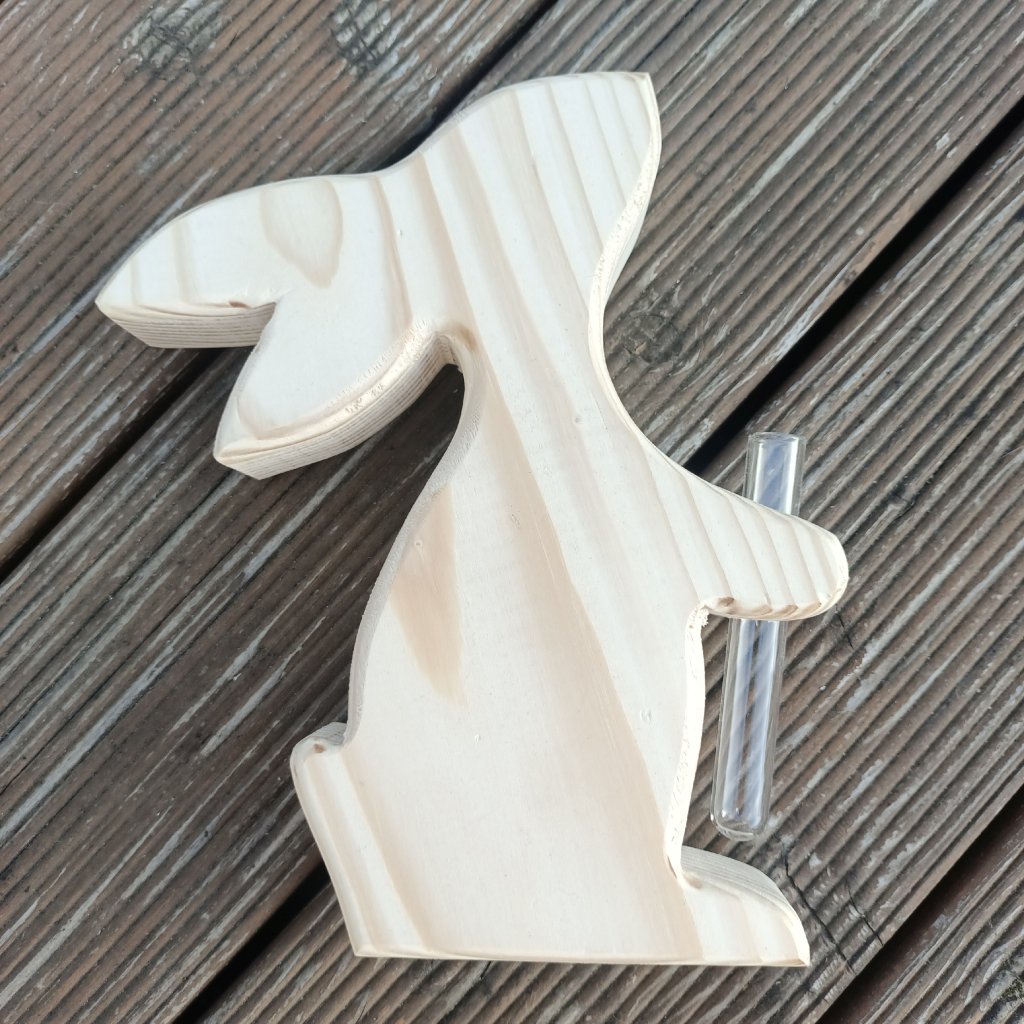 Dřevěný zajíček KÁJA je vyrobený ze smrkového nebo modřínového dřeva o hloubce 4 cm. Každý zajíček má svoji skleněnou vázičku pro vkládání živé nebo sušené květiny. Vázičku lze vyjmout a nahradit třeba velikonoční žílou nebo jinou dekorací.