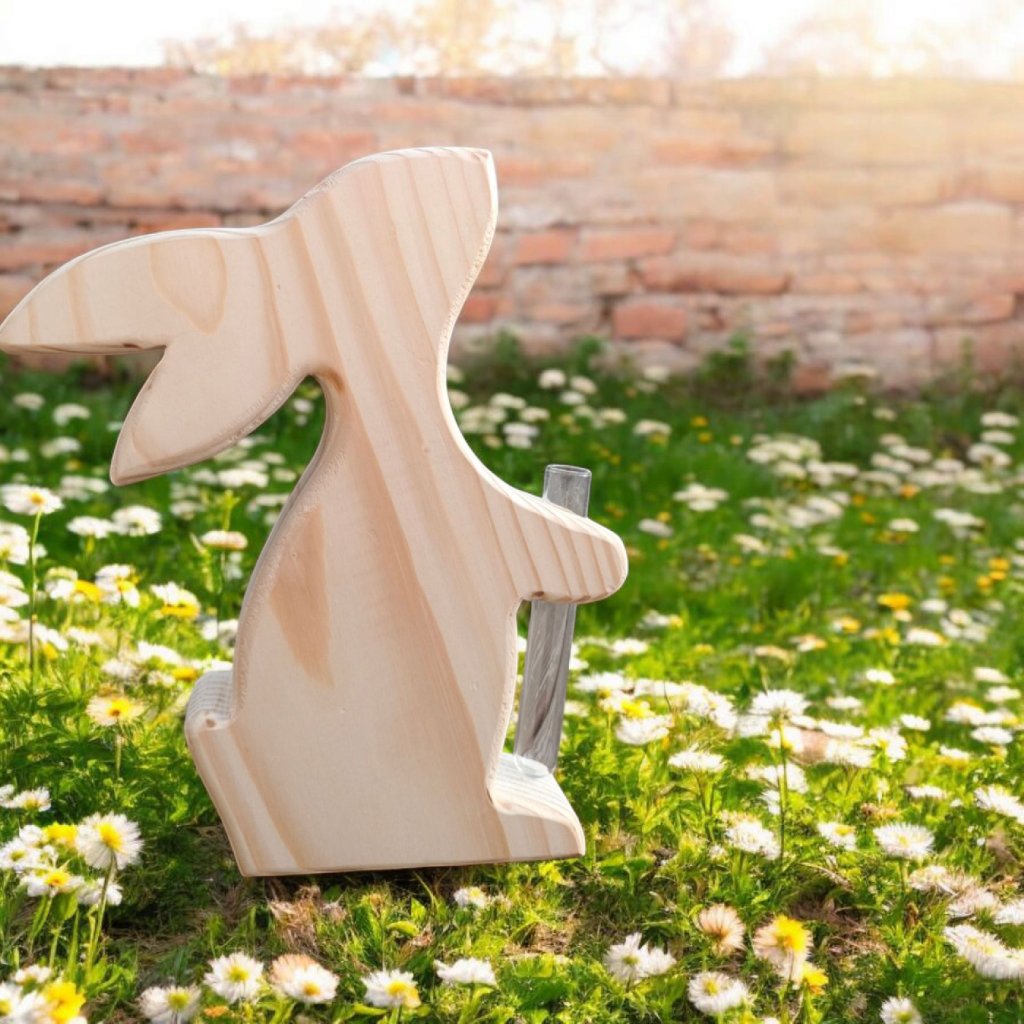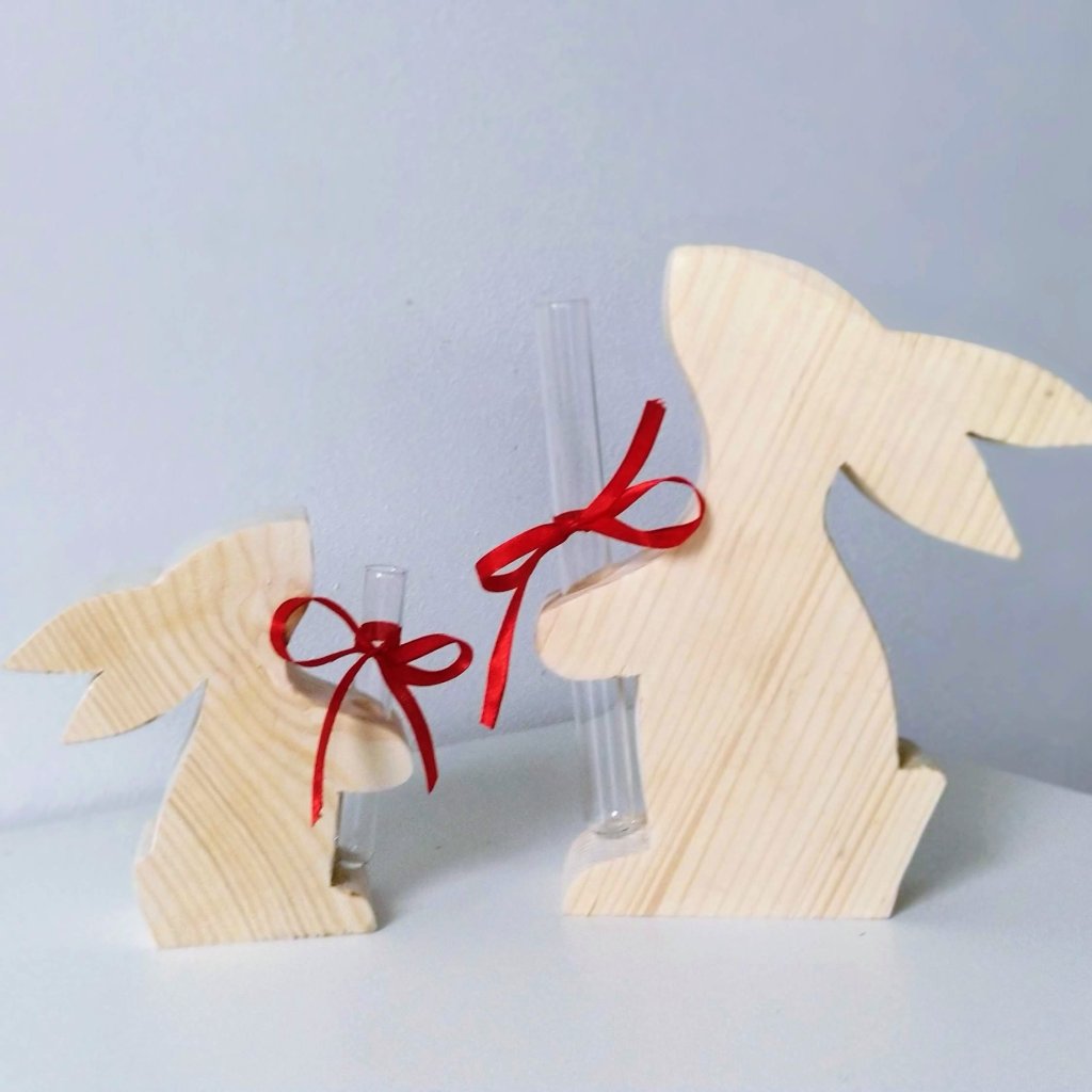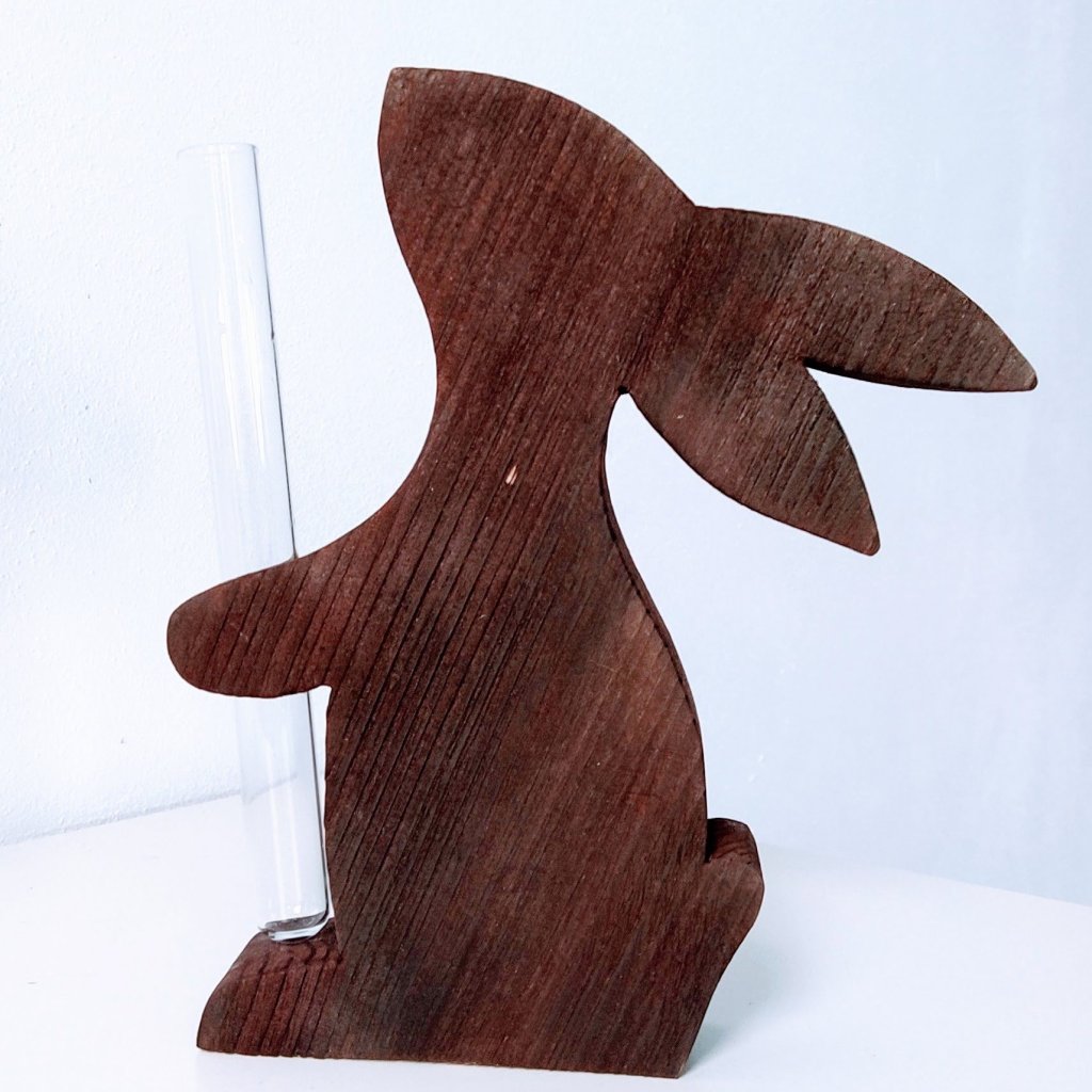 Dřevěný zajíček KÁJA je vyrobený ze smrkového nebo modřínového dřeva o hloubce 4 cm. Každý zajíček má svoji skleněnou vázičku pro vkládání živé nebo sušené květiny. Vázičku lze vyjmout a nahradit třeba velikonoční žílou nebo jinou dekorací.