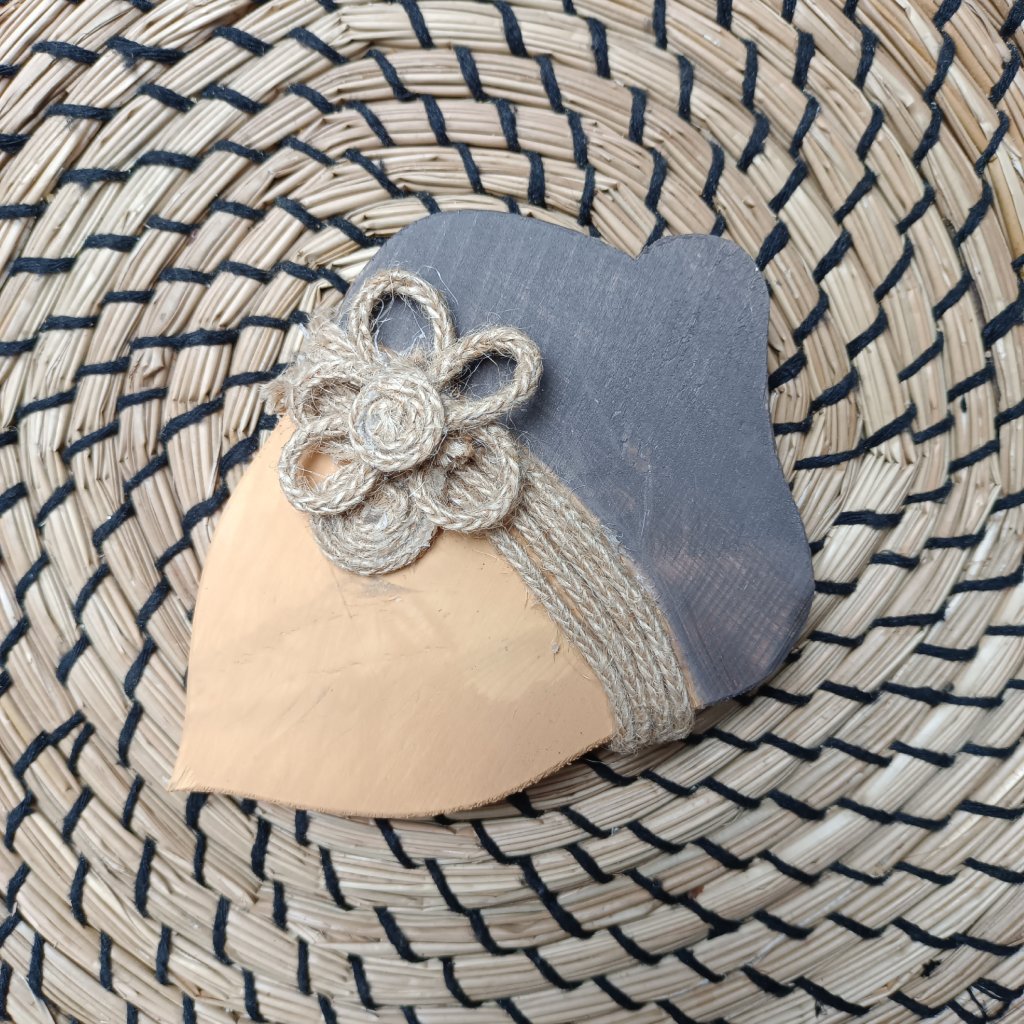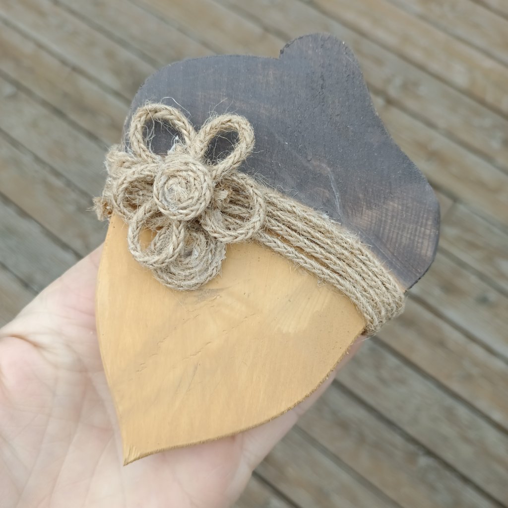 Dřevěný žalud ze smrkového dřeva tloušťky 1 cm domalovaný a doplněný drobnou provázkovou aplikací. Vyrobeno v autorské kolekci - k dispozici je vždy jen právě vyrobený kus.